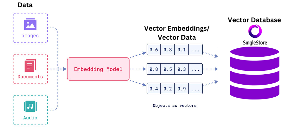 Basically, it is the process of converting data (like text, media) into numerical vectors (a list of numbers).