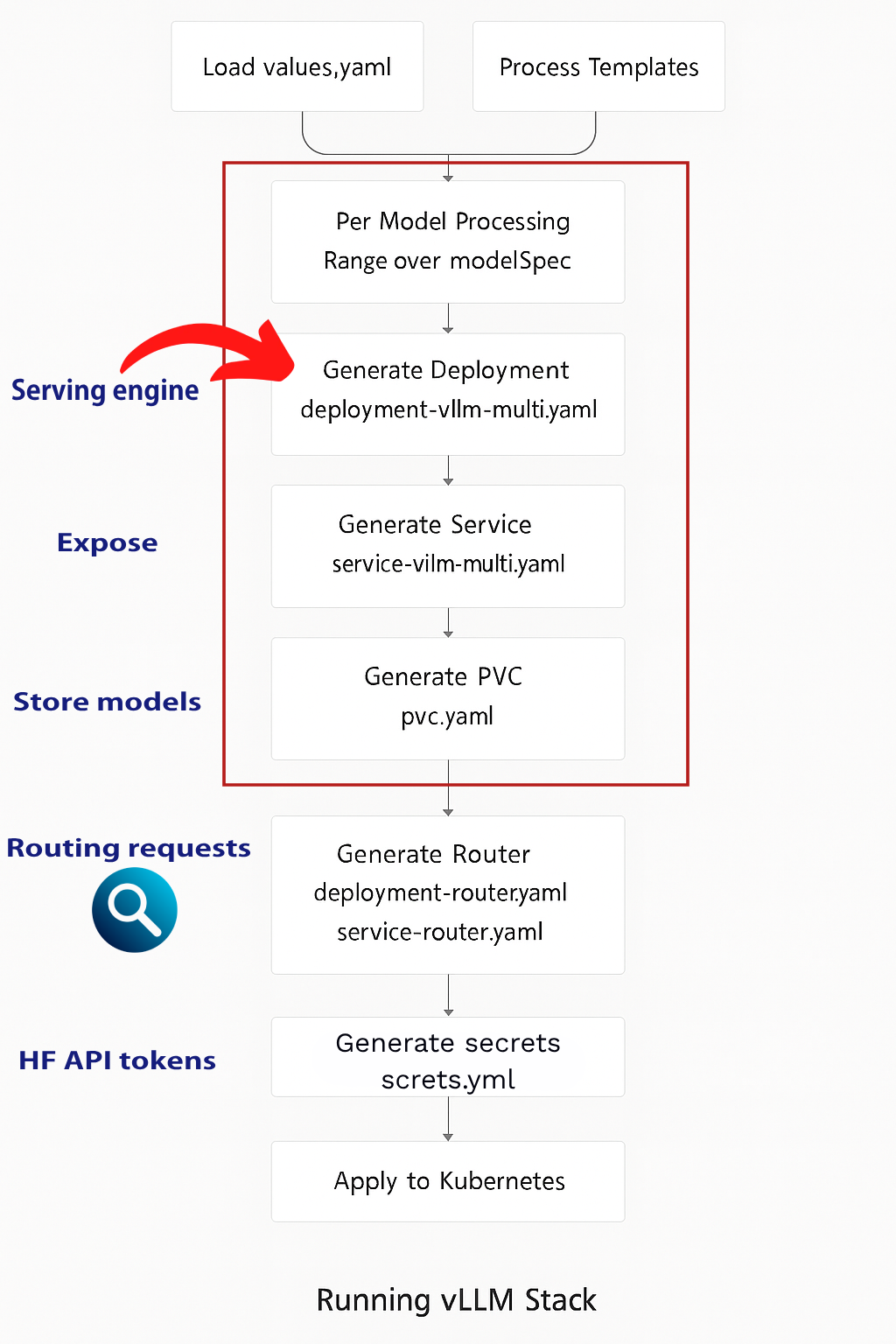 - Deploys the vLLM stack via Helm