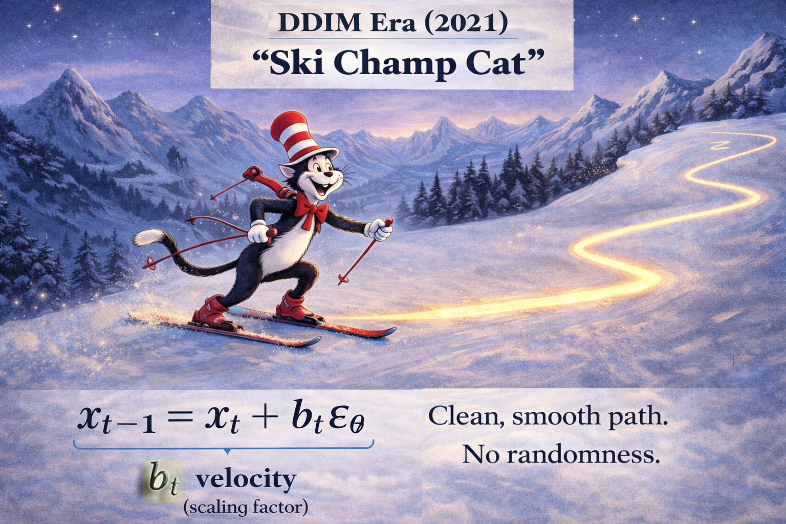 Song et al. asked one question: what if we removed the random stumble entirely? DDIM replaced the stochastic process with a deterministic ODE — the model carves a smooth, predictable curve toward the destination. No random kicks. Same starting noise + same prompt = same image every time. And because the path is smooth, you can skip steps (larger leaps)— reducing 100s steps to 50 without losing noticeable quality.