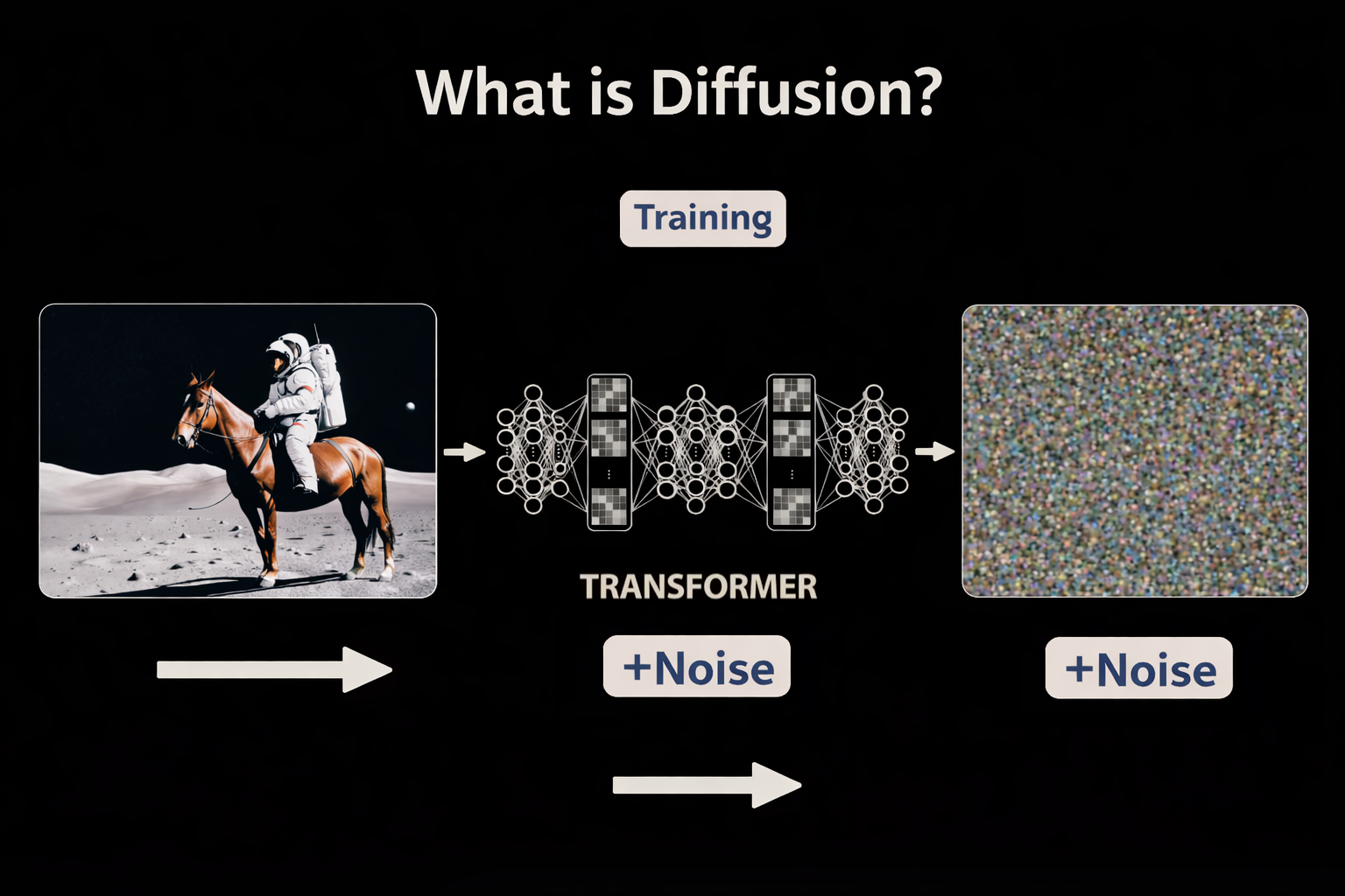 In physics, diffusion is what happens when you drop ink into water or leave perfume in a room: it spreads, it fills the space, it doesn’t reverse. Structure dissolves into chaos, and entropy wins. Diffusion models expand on this natural phenomenon by learning how to run it backwards. From sharp image to noise (train), and back again (inference).